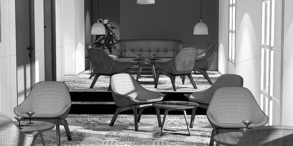 textures, de l'éclairage ambiant et du rendu. Chaque élément du mobilier a été modélisé spécialement pour le projet à partir des informations