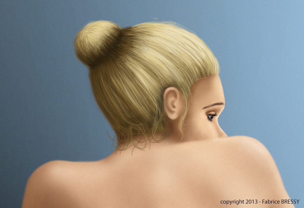 Ensuite je "peins" sur le dessin scané en utilisant différents jeux de calques pour appliquer diverses couches tels que les parties éclairées et les ombres ou encore les différentes parties du corps.