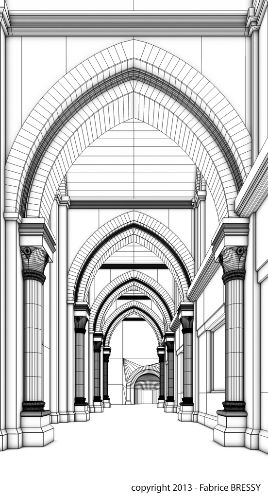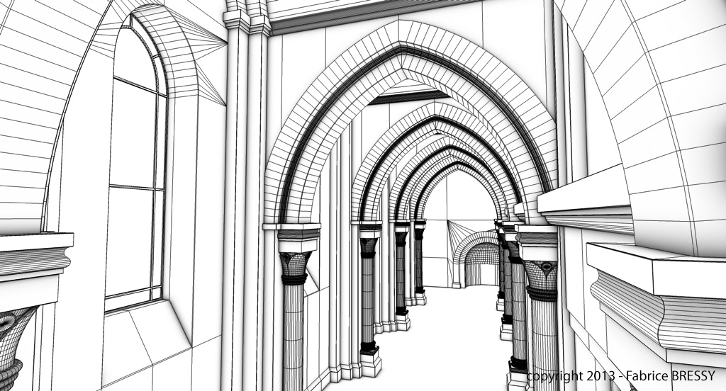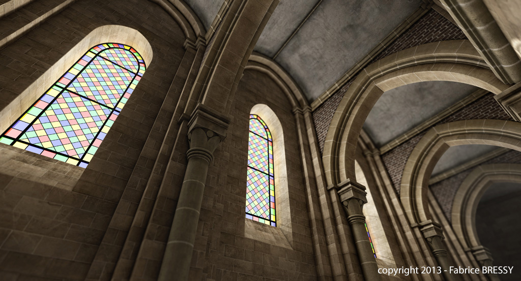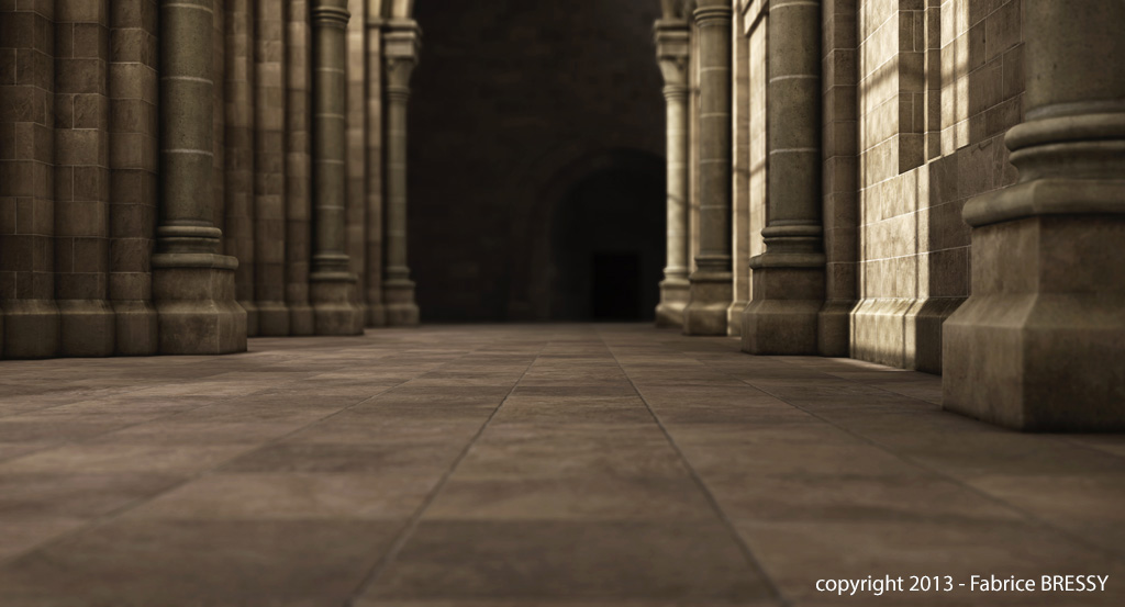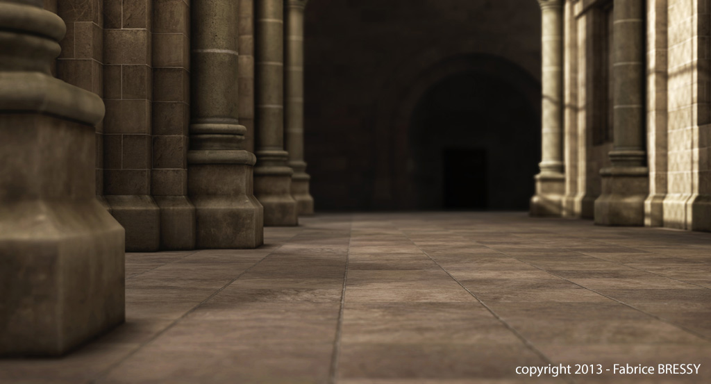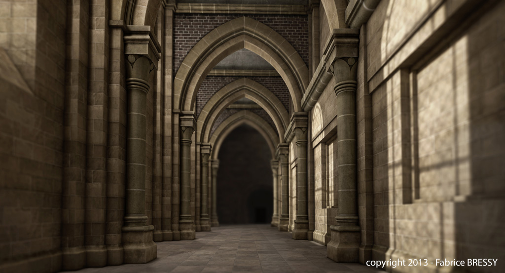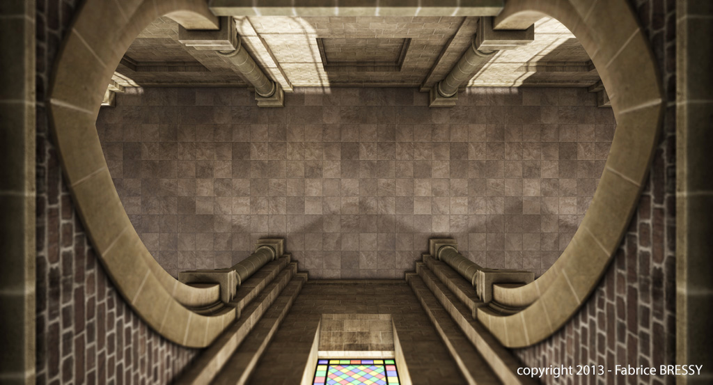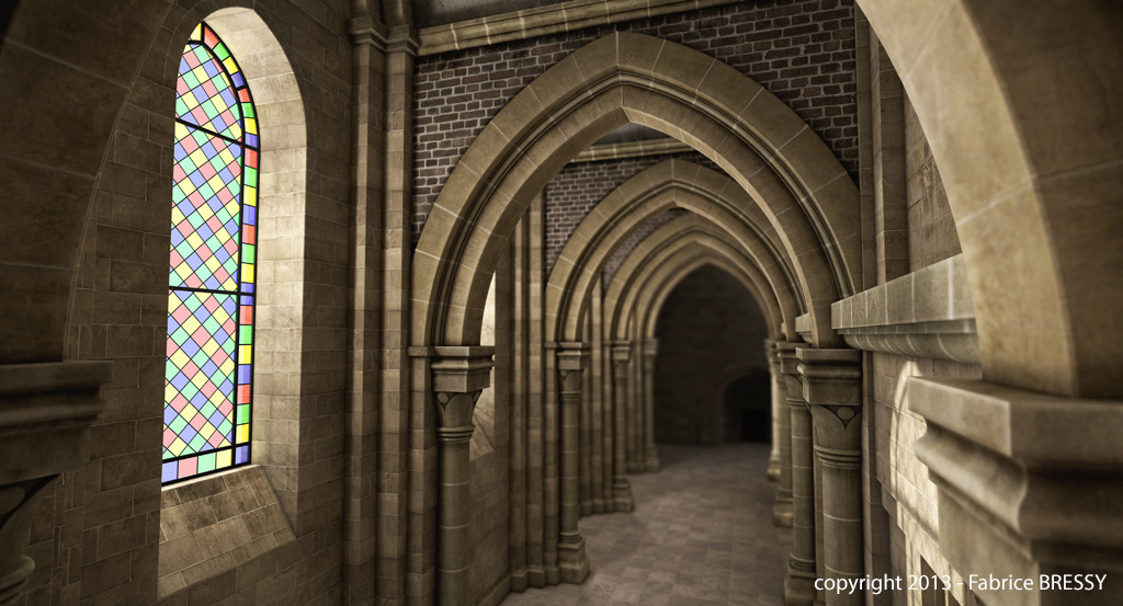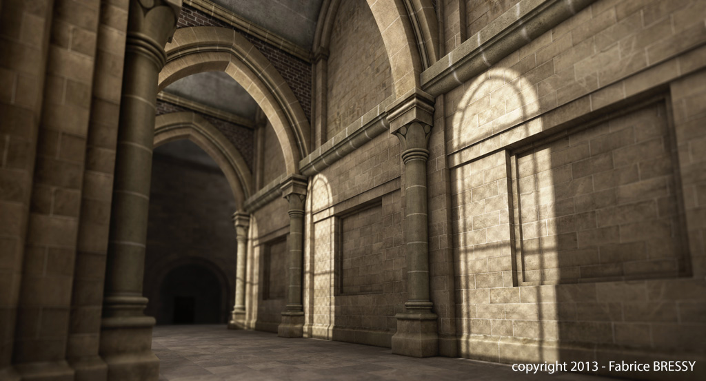 J'ai eu l'idée de modéliser cet intérieur à partir d'un dessin réalisé lors d'un séjour dans l'abbaye d'Orval (Belgique).