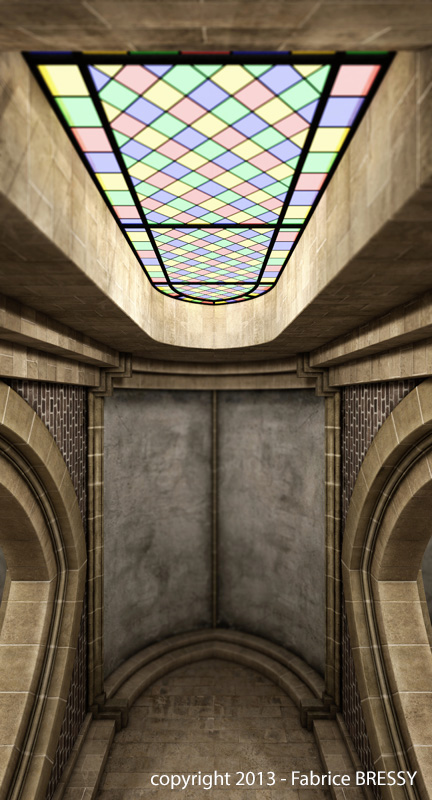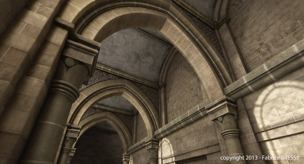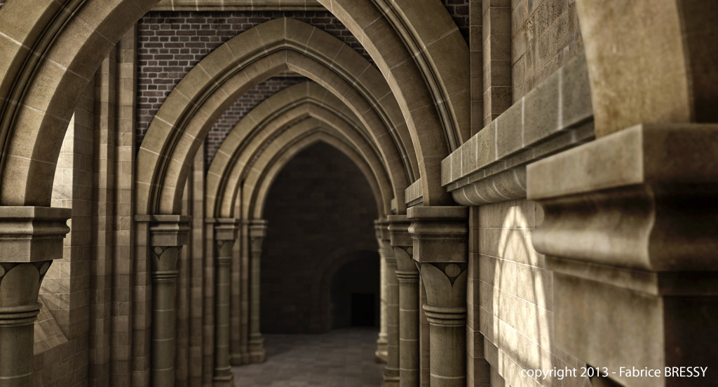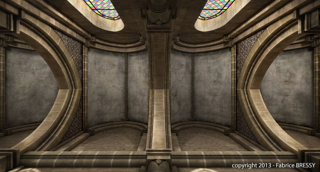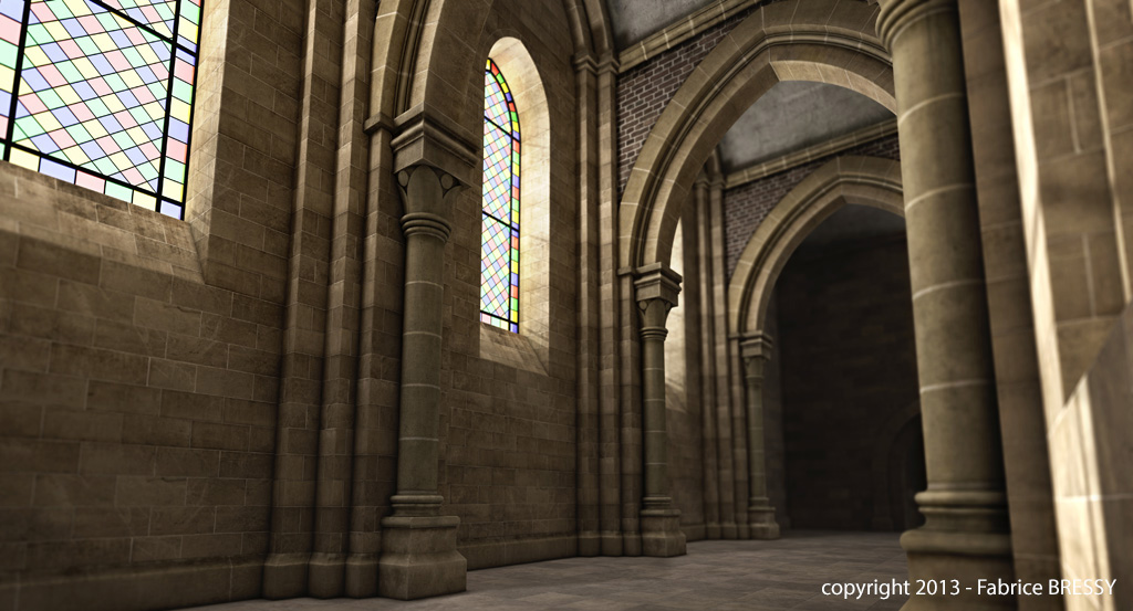 J'ai eu l'idée de modéliser cet intérieur à partir d'un dessin réalisé lors d'un séjour dans l'abbaye d'Orval (Belgique).